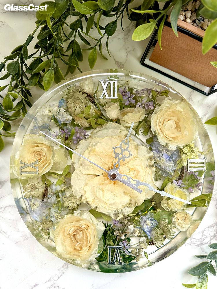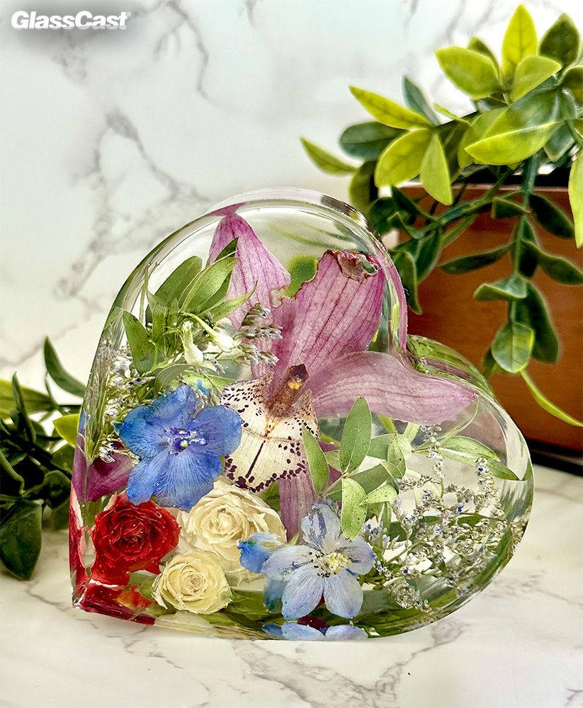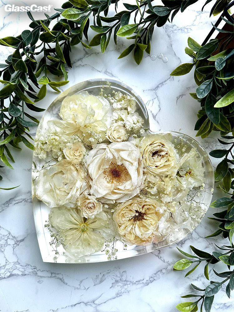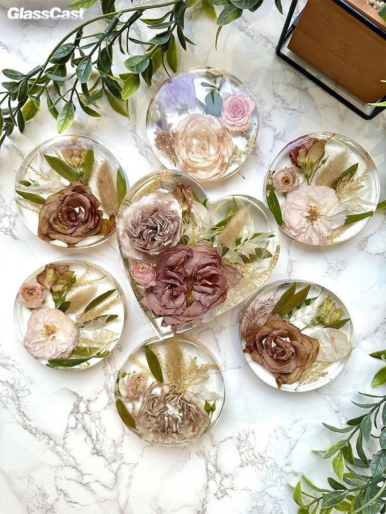 Clare dries all flowers in silica gel before encapsulating them in GlassCast resin using a variety of different moulds. Preserving memories forever.