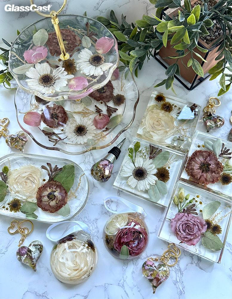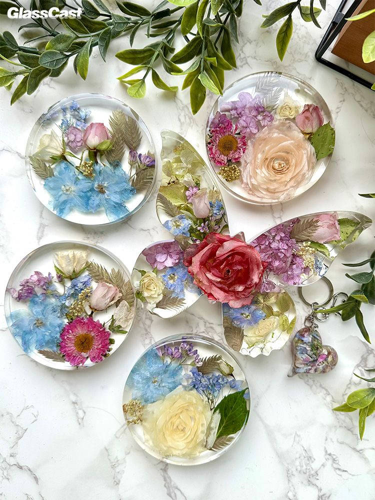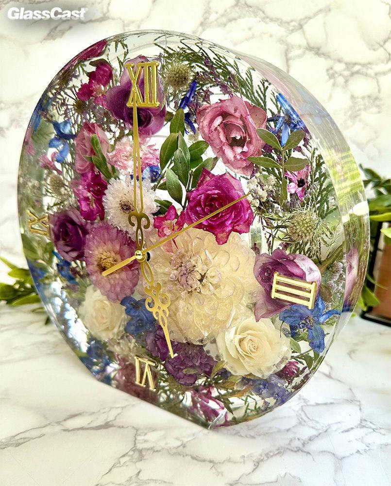 Clare dries all flowers in silica gel before encapsulating them in GlassCast resin using a variety of different moulds. Preserving memories forever.