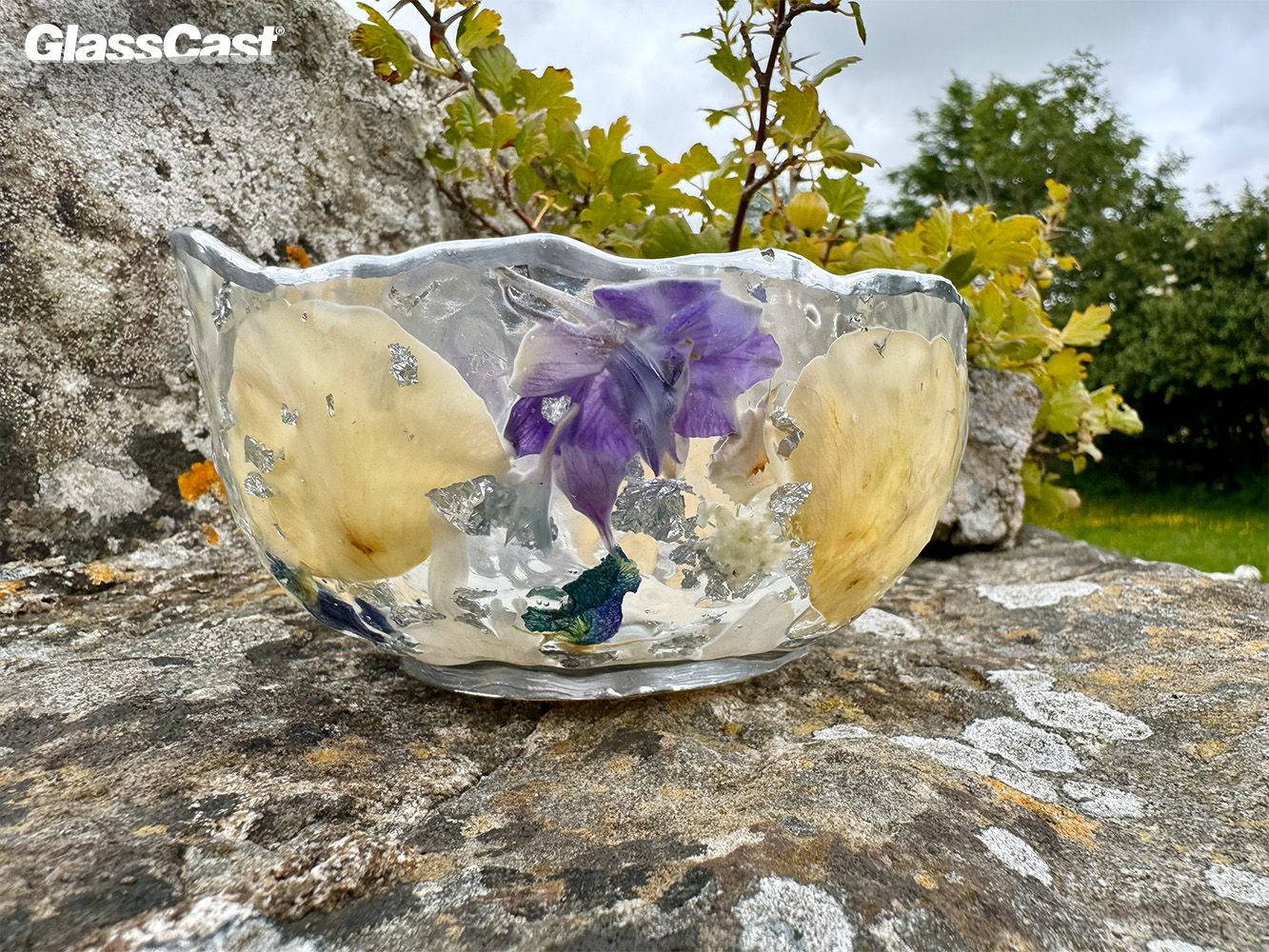 This beautiful selection of flower bowls have been made by Kate using flowers and petals encapsulated in clear and pigmented resin in complimentary colours. Once cured the bowl edges are finished with metallics.