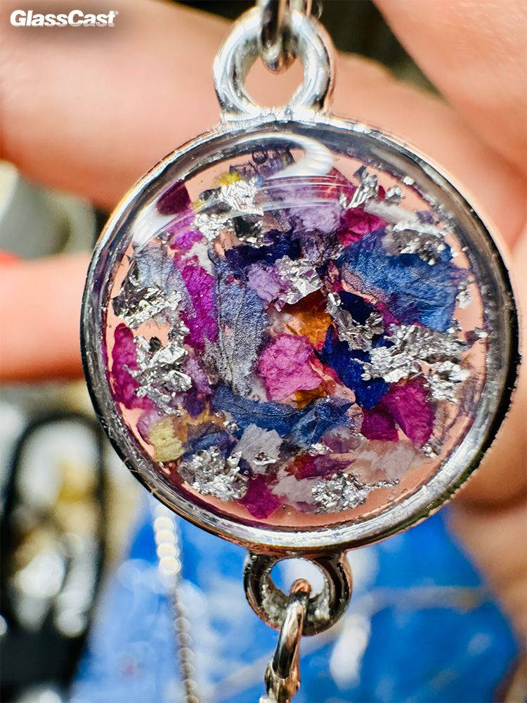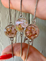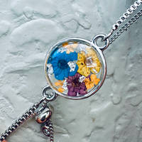 This stunning selection of bracelets have been made by Kate using flowers and petals which have been dried out before being encapsulated in clear resin in open back bezels.